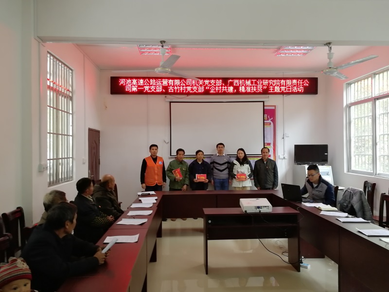 為激發(fā)支部黨建工作新活力,錘煉提升企業(yè)黨員黨性修養(yǎng),強(qiáng)化黨建引領(lǐng),助力脫貧攻堅(jiān),推動(dòng)黨建工作與扶貧工作相互促進(jìn)。11月28日,廣西機(jī)械工業(yè)研究院有限責(zé)任公司第一黨支部前往大化縣扶貧點(diǎn)七百弄鄉(xiāng)古竹村,與河池高速公路運(yùn)營(yíng)有限公司機(jī)關(guān)黨支部、古竹村黨支部聯(lián)合開(kāi)展“企村共建,精準(zhǔn)扶貧”主題黨日活動(dòng)。