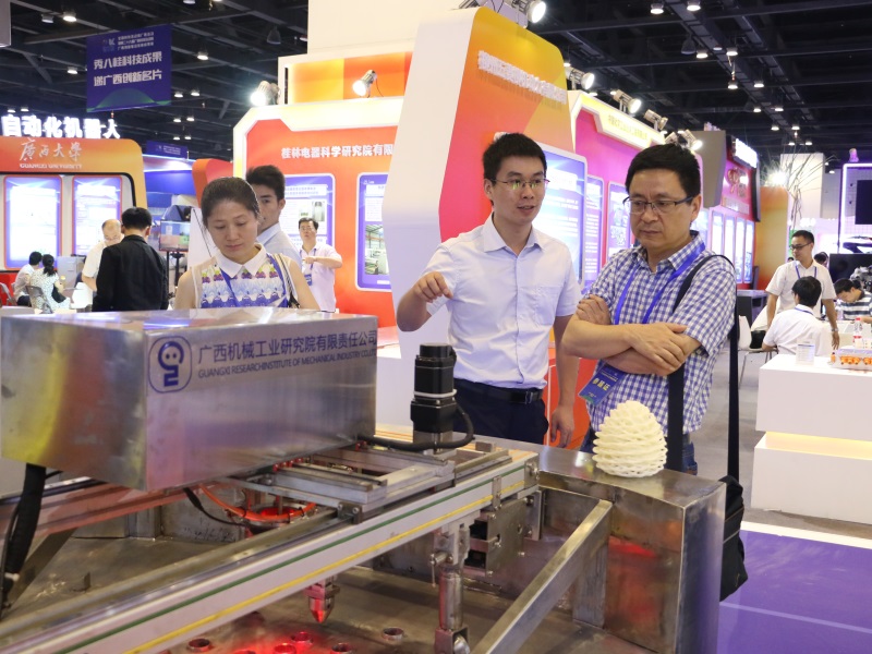 此次展會(huì)以“創(chuàng)新支撐發(fā)展,建設(shè)壯美廣西”為主題,機(jī)械院公司除了作為廣西先進(jìn)制造的突出成就單位落戶于廣西科技支撐產(chǎn)業(yè)高質(zhì)量發(fā)展展區(qū)的先進(jìn)制造板塊(以下簡稱“先進(jìn)制造”展區(qū)),同時(shí)還作為南寧市重大專項(xiàng)的科技成果創(chuàng)新單位亮相于南寧市的區(qū)域展廳。機(jī)械院公司近年來貫徹落實(shí)“中國制造2025”工作要求,加快推進(jìn)“互聯(lián)網(wǎng)+工業(yè)”行動(dòng),促進(jìn)互聯(lián)網(wǎng)、大數(shù)據(jù)、人工智能與制造業(yè)的深度融合,推動(dòng)“廣西制造”向“廣西智造”轉(zhuǎn)變。在“先進(jìn)制造”展區(qū),我司的精品“三劍客”--套裝式內(nèi)外袋物料包裝全自動(dòng)生產(chǎn)線、高壓清洗機(jī)器人系統(tǒng)和3D打印項(xiàng)目閃耀登場,傾力展示工業(yè)機(jī)器人領(lǐng)域以及3D打印領(lǐng)域的創(chuàng)新成果。