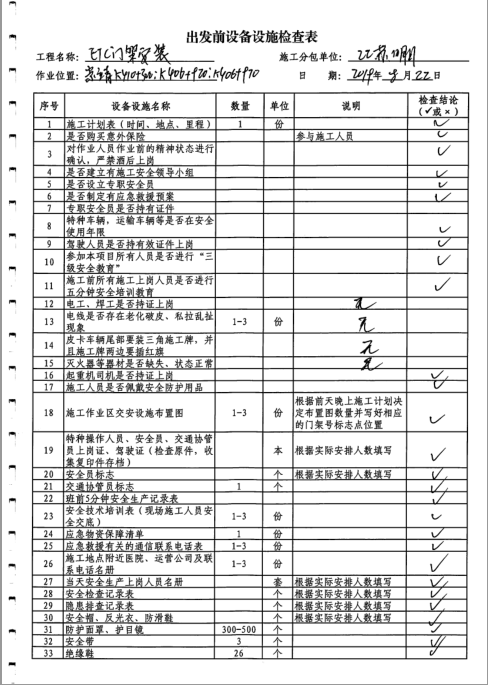 二是安全檢查更加全面,公司安全管理部針對現(xiàn)場暴露的安全隱患細(xì)項進行規(guī)整,制定了《安全設(shè)施檢查表》、《施工作業(yè)現(xiàn)場檢查表》、《離場檢查表》等安全防護措施表單,細(xì)項多達101條,要求現(xiàn)場安全員對標(biāo)對表查漏補缺,盡可能做到不留隱患、不留疑問,有效提升了安全工作的計劃性和交安設(shè)施擺放效率。