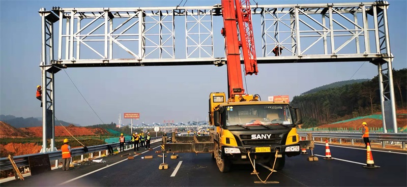 1月8日下午2點,由柳州格瑞米公司生產(chǎn)的廣西第一個情報板門架在南寧東收費站成功吊裝