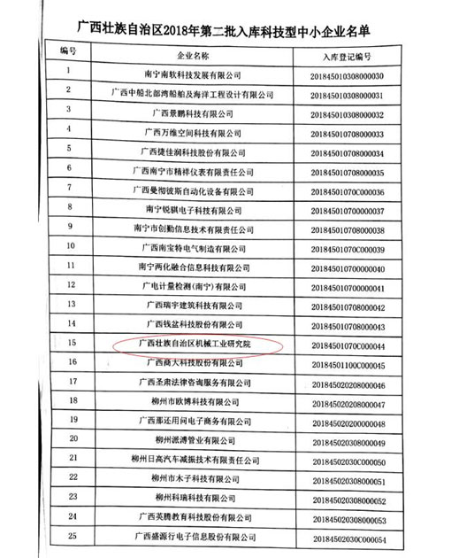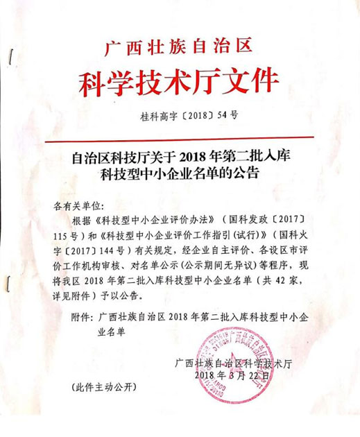 近日,廣西科技廳公告了2018年第二批入庫科技型中小企業(yè)的名單,我院入庫該名單之列。