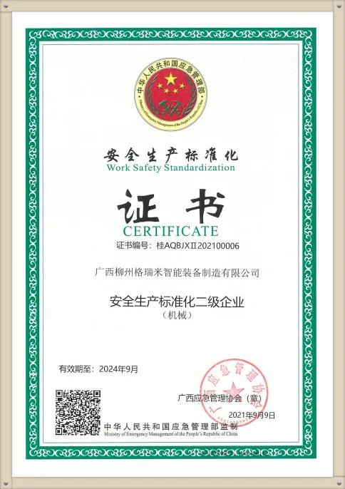 2021年10月27日,柳州格瑞米公司順利通過(guò)安全生產(chǎn)標(biāo)準(zhǔn)化評(píng)審,取得廣西應(yīng)急管理協(xié)會(huì)簽發(fā)的認(rèn)證證書(shū),成為安全生產(chǎn)標(biāo)準(zhǔn)化二級(jí)企業(yè)(機(jī)械)。