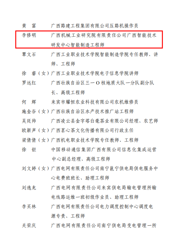 習(xí)近平總書記指出:“創(chuàng)新的事業(yè)呼喚創(chuàng)新的人才?!睘橥苿赢a(chǎn)業(yè)工人不斷提高技術(shù)水平,煥發(fā)創(chuàng)新創(chuàng)造活力,近日,自治區(qū)總工會公布了廣西五一勞動獎?wù)潞蛷V西工人先鋒號表彰名單,機械院梅開二度,時隔一年再次上榜,李修明同志獲授“廣西五一勞動獎?wù)隆薄?